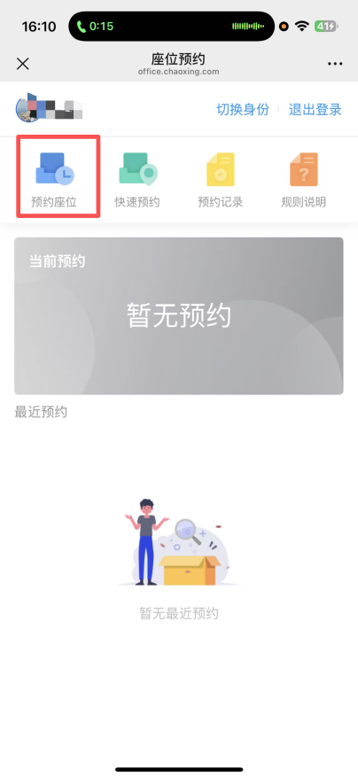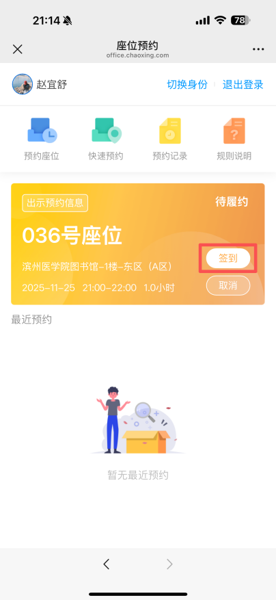 签到:预约完成后可扫描已预约座位桌子上的座位牌二维码进行签到,签到完成后使用状态会从“待履约”变为“学习中”