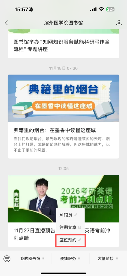 预约:进入“滨州医学院图书馆”微信公众号“图书馆”-->点击“便捷服务”-->点击“座位预约”-->进入登录界面选择