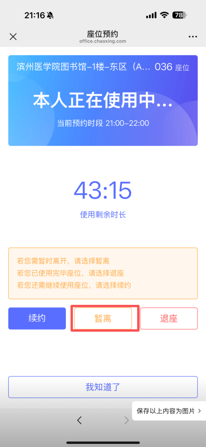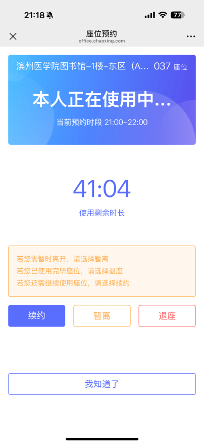 暂离结束回到座位后扫描桌子上的座位牌二维码,点击“开始使用”即可结束暂离