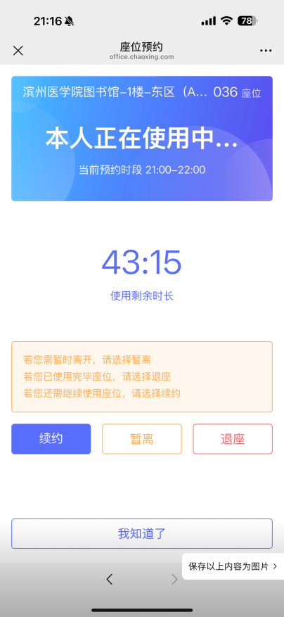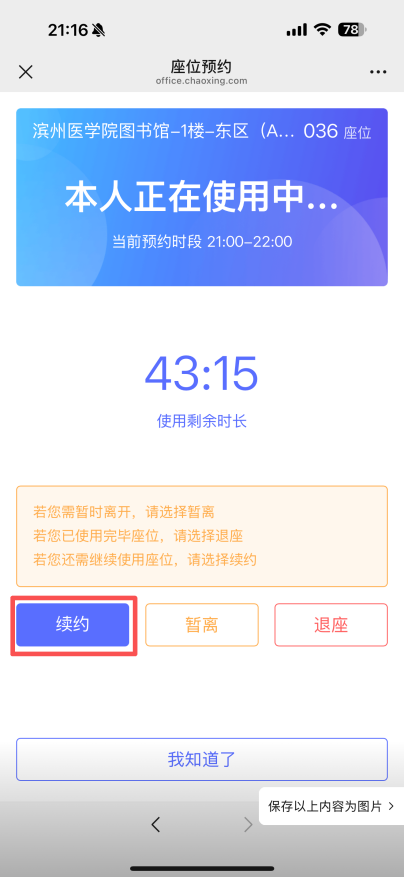 扫描需要续约座位的座位牌二维码-->点击“续约”,选择续约的时间段后点击“确定”即可续约成功