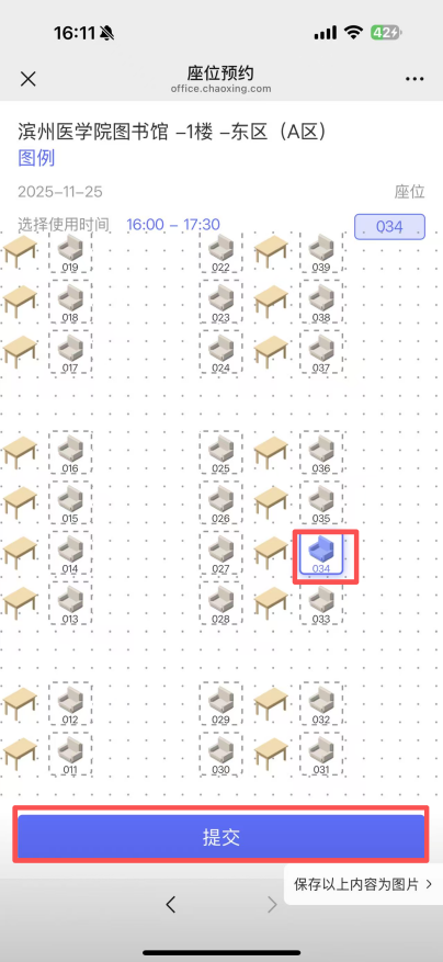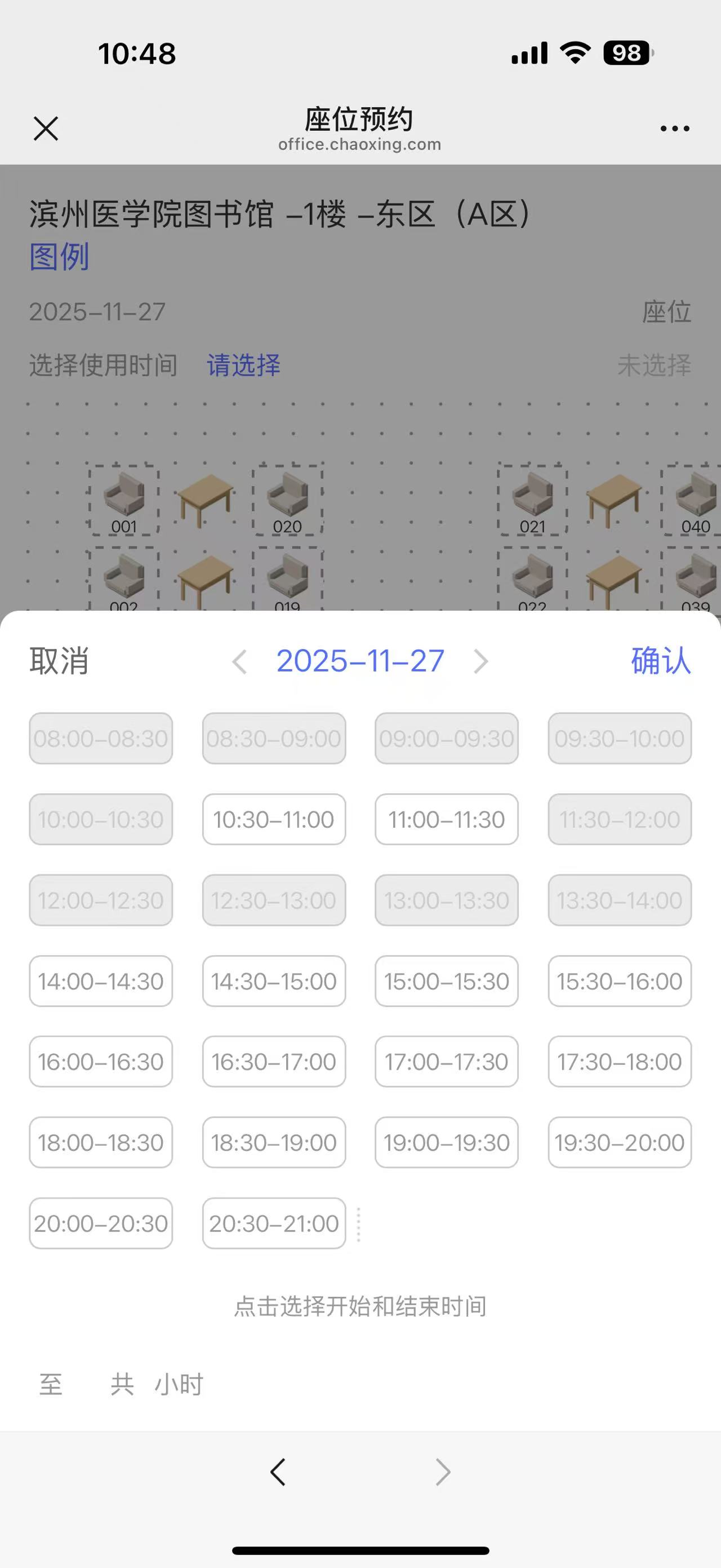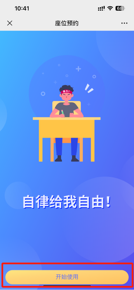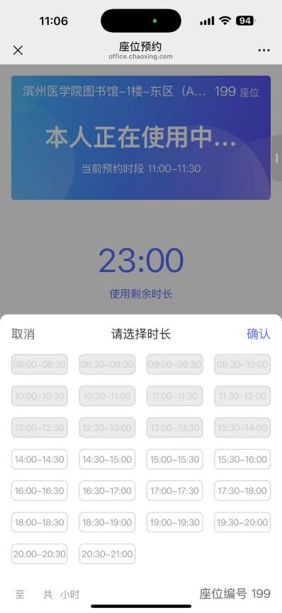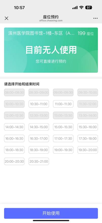 进入图书馆后扫描需要预约座位的座位牌上的二维码-->选择想要预约的时间端,点击“开始使用”即可完成预约