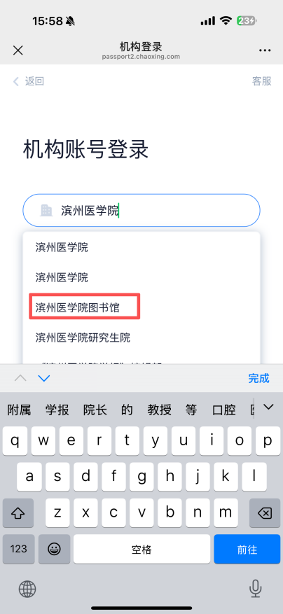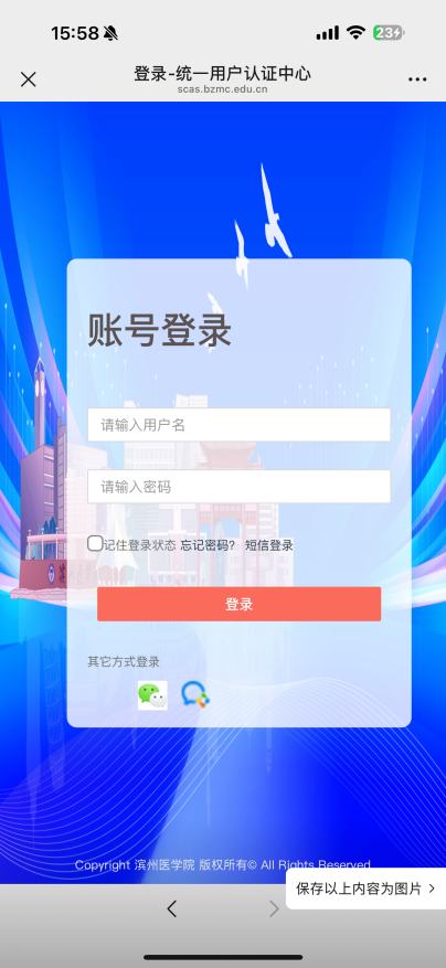 “其他方式登录”-->输入滨州医学院后选择“滨州医学院图书馆”-->进入统一身份认证界面输入账号密码点击登录按钮-->点击“座位预约”-->点击“预约选座”-->选择需要预约的区域-->选择需要预约的时间后进行座位选择,选择完成后点击“提交”即可完成座位预约