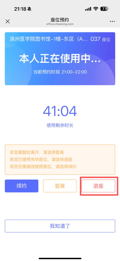 扫描需要退座座位桌子上的座位牌二维码点击“退座”或直接刷卡出闸机即可自动退座