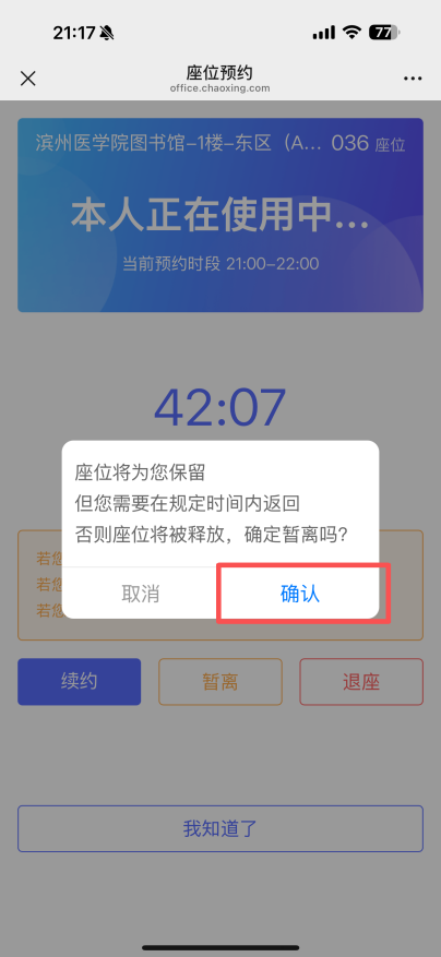 扫描需要暂离座位桌子上的座位牌二维码-->点击“暂离”后点击弹窗中的“确定”即可完成暂离